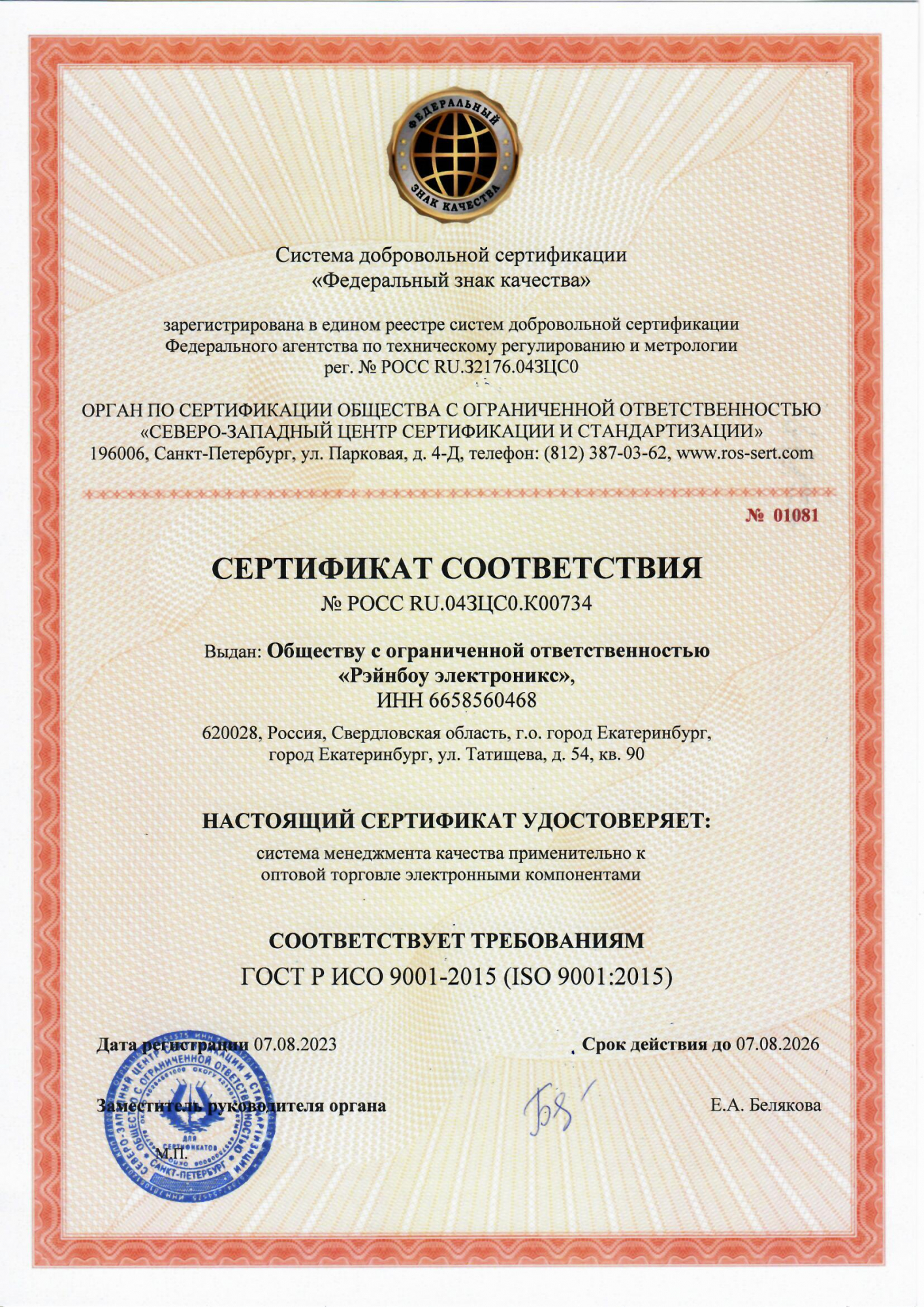 Наша компания прошла сертификацию по системе менеджмента качества ISO9001:2015 о получила сертификат соответствия применительно к оптовой торговле электронными компоненатами.